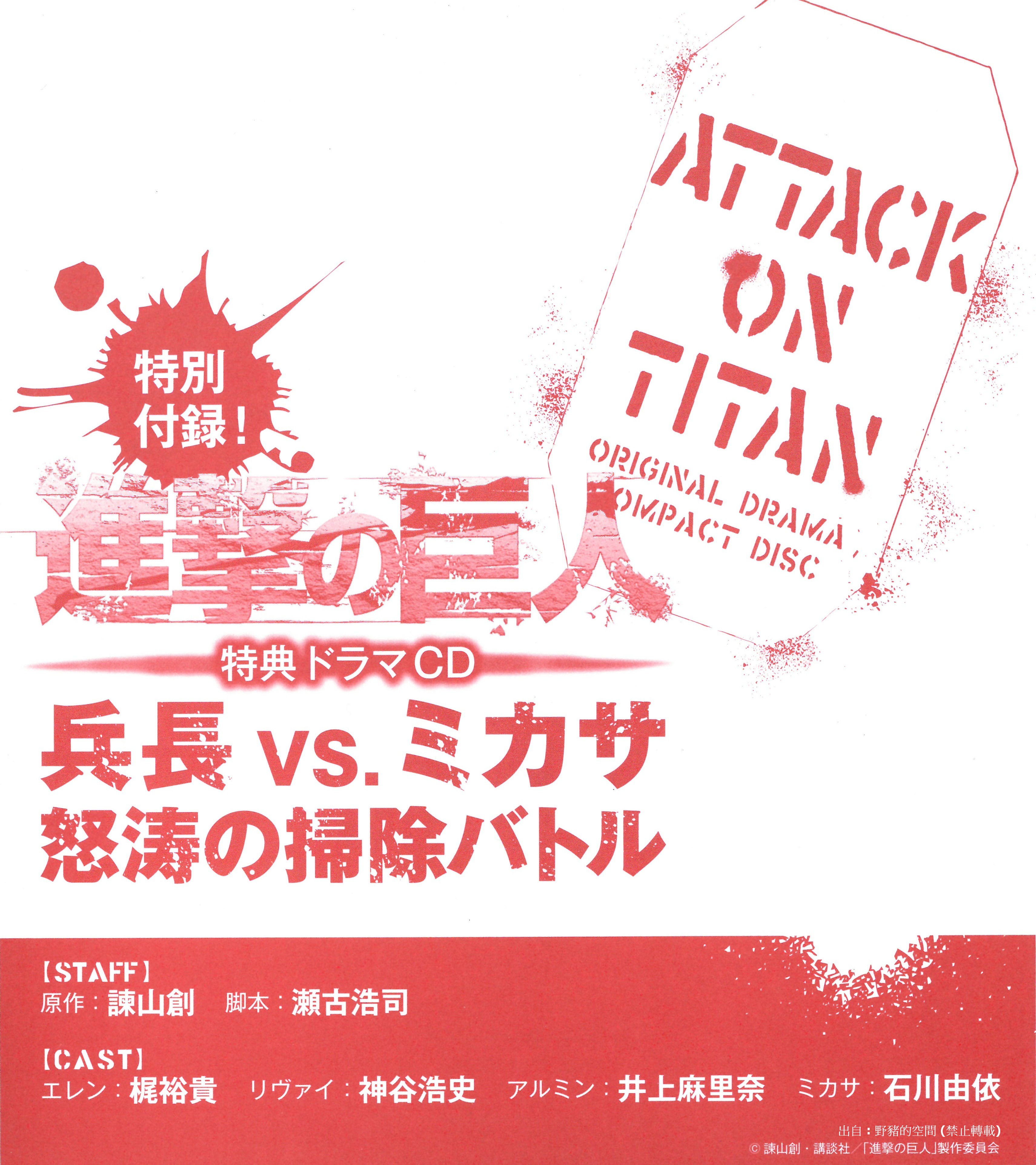 Attack on Titan Bonus Drama CD Heichou vs. Mikasa Dotou no Souji Battle進撃の巨人 特典ドラマCD 兵長vs.ミカサ 怒涛の掃除バトルAttack on Titan Bonus Drama CD Heichou vs. Mikasa Dotou no Souji Battle
